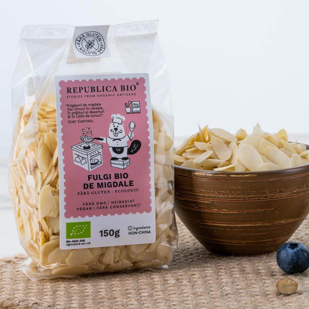 Lista completa de ingrediente: 100% migdale ecologice.Fulgii Bio de migdale Republica BIO pot fi rontaiti ca atare pentru o gustare, adaugati in muesli, prajituri si salate pentru o textura crocanta sau ca decor pe torturi si inghetata.