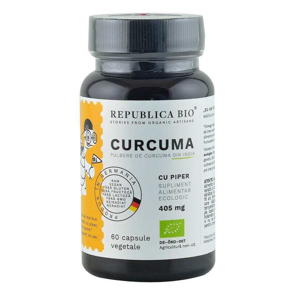 Curcuma (Turmeric) cu piper este un supliment nutritiv certificat ecologic, produs in Germania pentru Republica BIO.
