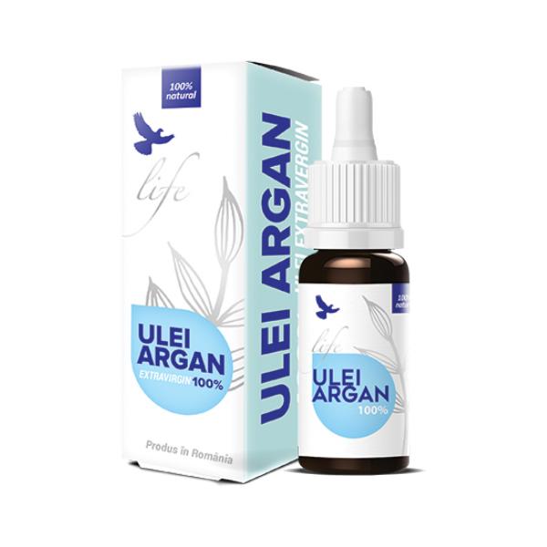 Uleiul de argan, denumit si “aurul Marocului”, ofera pielii o ingrijire completa, mentinandu-i sanatatea si frumusetea si aducandu-i numeroase beneficii. Are proprietati intens hidratante si nutritive, imbunatateste elasticitatea pielii, are efect de intinerire, reduce ridurile si vergeturile, ajuta la reglarea secretiei de sebum si previne blocarea si infectiile la nivelul glandelor sebacee. Este ideal pentru ingrijirea tenului expus la frig, imbatranit, acneic, sensibil si uscat, se absoarbe usor si creeaza o pelicula invizibila ce mentine hidratarea si protejeaza epiderma pe termen lung. Este ideal si pentru ingrijirea parului, redandu-i luciul si elasticitatea si prevenind caderea sa si aparitia matretii, precum si pentru intarirea si refacerea unghiilor fragile si inmuierea cuticulelor. Produsul este 100% natural, fara solventi sintetici sau adaosuri chimice.